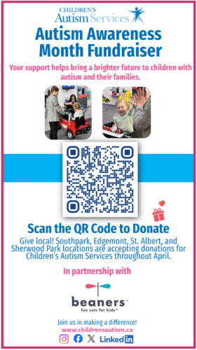We have partnered once again with Beaners Fun Cuts for Kids for our Autism Awareness Month Fundraiser! At four Beaners locations (Edmonton – South Park, Edmonton – Edgemont, Sherwood Park, and St. Albert), you can make a donation to Children’s Autism Services through our website: Click here